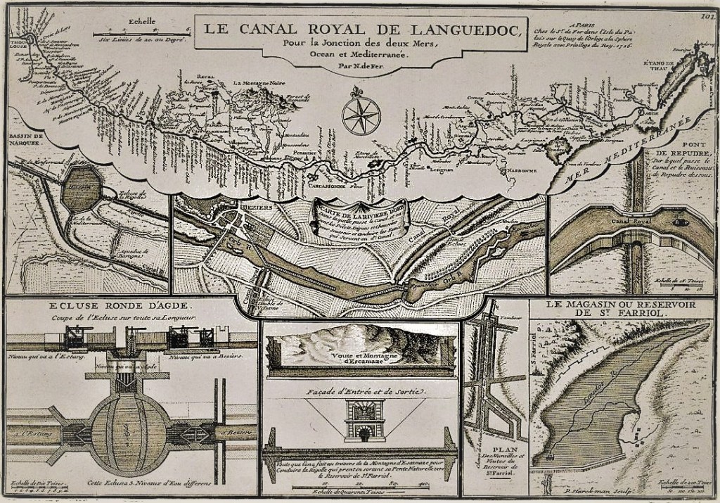 Le 24 mai 1681, pour l’inauguration de ce qui était connu alors sous le nom de Canal royal du Languedoc, Monseigneur d’Aguesseau, intendant de Louis XIV, arrive sur sa « barque royale » en haut des écluses de Fonséranes. Il est 10 heures du matin, et “un grand peuple s’était répandu sur les bords du canal”. Le convoi “fut d’abord salué par le corps des marchands, à cheval, précédé par des cymbales et des trompettes (…) Il se fit un feu d’artifice extraordinaire, auquel le canon de la ville répondit. Cette belle troupe descendit toutes les écluses sans quitter le bateau ; à chacune, elle était régalée de Vive le Roi !, de vers récités à la louange de sa majesté, ou de concerts de musique, (…) jusqu’au lit de la rivière où les consuls de Béziers, sur un bateau semé de fleurs de lys, l’attendaient en robes rouges.”