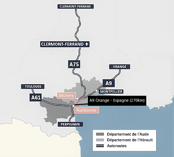 L’autoroute A9 entre l’Italie et l’Espagne longe Béziers, dite “La Languedocienne” (entre la ville d’Orange et l’échangeur de l’A61 au niveau de Narbonne) et La Catalane (de l’A61 à la frontière espagnole), est une autoroute française qui commence par la bifurcation de l’A7 à Orange en direction de Marseille (sens Nord-Sud), ou en direction de Lyon (sens Sud-Nord) via l’échangeur d’Orange sur la commune d’Orange. Elle se termine à la frontière espagnole, au raccordement avec l’autoroute espagnole AP-7, sur la commune du Perthus, dans les Pyrénées-Orientales. Elle fait partie des routes européennes E15 et E80.