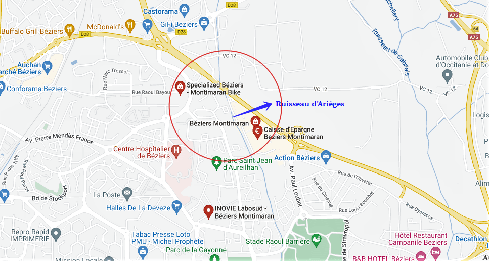 Dans cette allée, un ruisseau coule, le ruisseau d’Arièges. Prévu pour le ruissellement des pluies, à deux mètres de profondeur, il glisse tranquillement dans son lit.