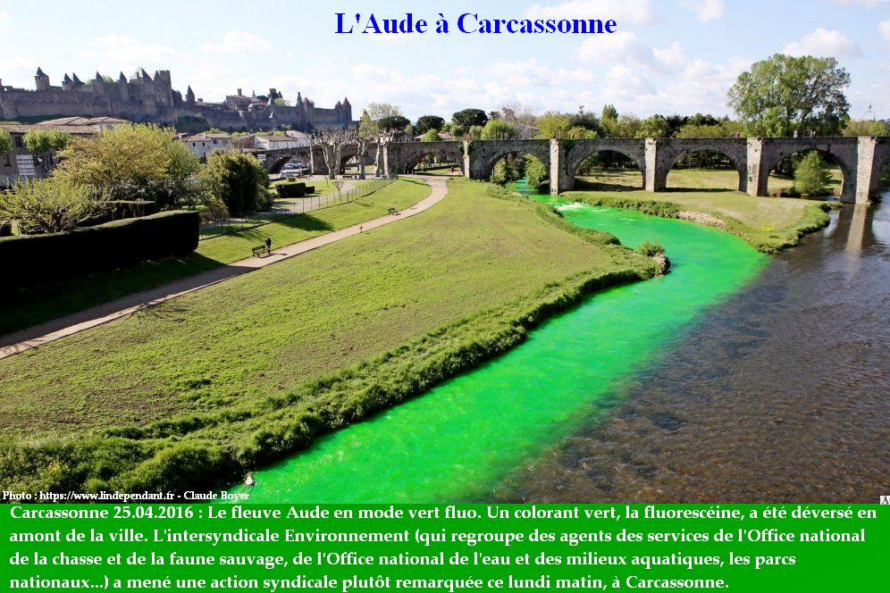 L’Aude passe ensuite à Carcassonne, se rapproche du canal du Midi qu’elle côtoie parallèlement jusqu’à la mer. Elle reçoit le Fresquel, descend au Sud, passe à Trèbes où elle reçoit l’Orbieu, et traverse une campagne bossuée de coteaux couverts de vignes ou de céréales.