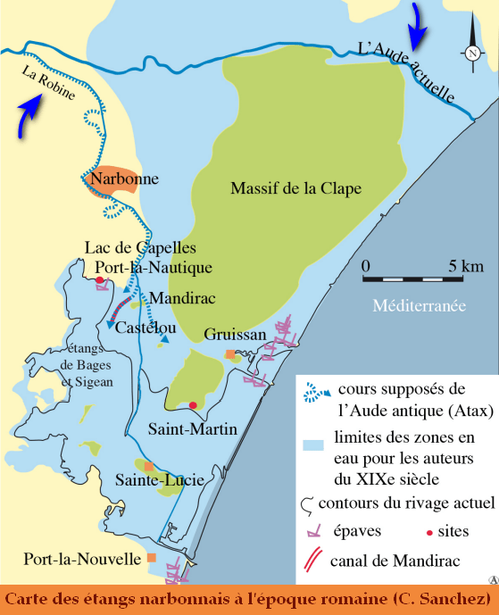 Jusqu’au Moyen-Age, l’Atax (l’Aude) forme un vaste delta et se sépare en deux bras : la branche sud emprunte quasiment le tracé actuel du canal de la Robine et débouche dans le lac narbonnais ; la branche nord suit à peu près le cours actuel du fleuve. Mais au XIVe siècle, de violents orages charrient des millions de mètres cubes de limons et de graviers qui comblent le lit du bras sud : les eaux de l’Aude contournent alors la montagne de la Clape et se jettent dans l’étang de Vendres.
