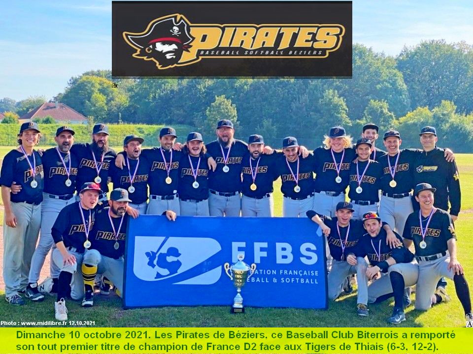 12.10.2021 Ce dimanche 10 octobre 2021 fera date dans l’histoire des Pirates de Béziers. Le Baseball Club Biterrois a remporté son tout premier titre de champion de France D2 face aux Tigers de Thiais (6-3, 12-2).