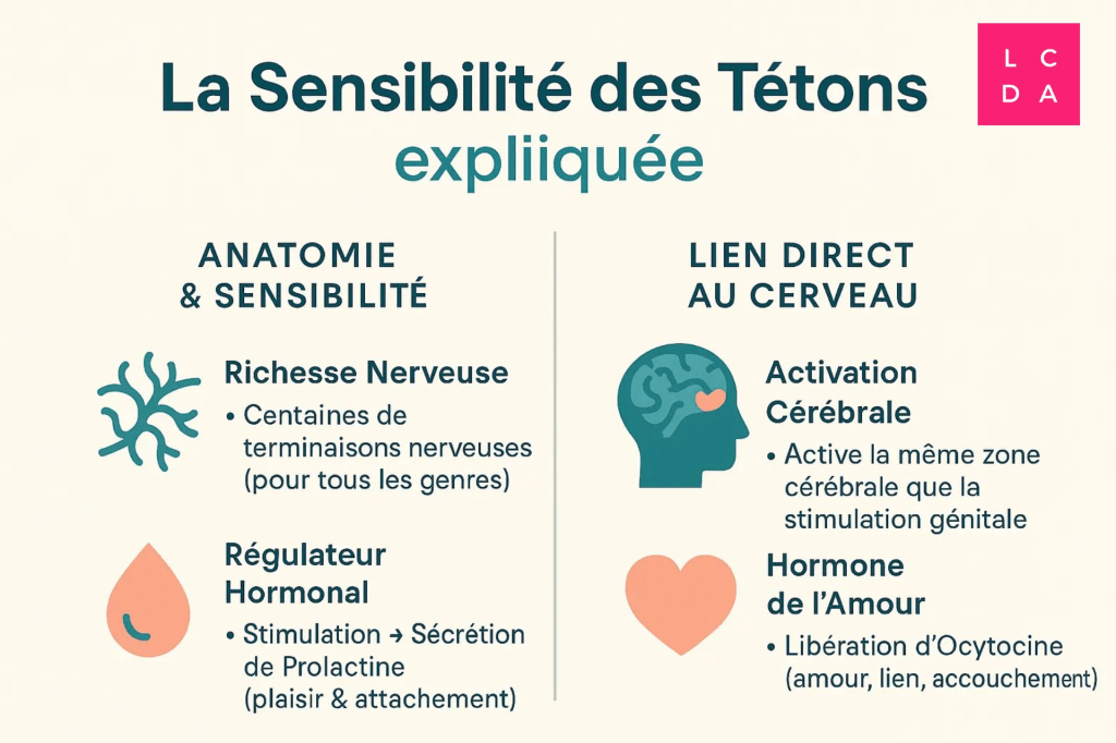Tout comme la peau très fine des seins, les tétons et les aréoles sont des zones riches en terminaisons nerveuses, très sensibles à la stimulation. Les nerfs des seins envoient des signaux au cerveau via le système nerveux et ces signaux peuvent stimuler les centres de plaisir. Spoiler alert : les messages nerveux arrivent au même endroit que lors de la stimulation des organes génitaux. C’est grâce à ce circuit très bien fait que l’on peut avoir un orgasme mammaire.