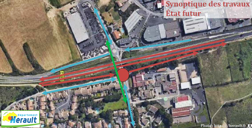 De mi 2021 à fin 2022, le tronçon entre le rond-point VincentBadie et l’échangeur de La Devèze (sortie de l’autoroute) sera enfin mis à 2×2 voies Le dernier chantier sera le plus important. Du premier semestre 2021 à fin 2023, ce sera au tour de la création de la dénivellation du rondpoint de la Méditerranée (dit “de Cers”) avec la réalisation d’un ouvrage remarquable : un viaduc de 120 m de long. La rocade (la route d’Agde) passera au-dessus du giratoire.