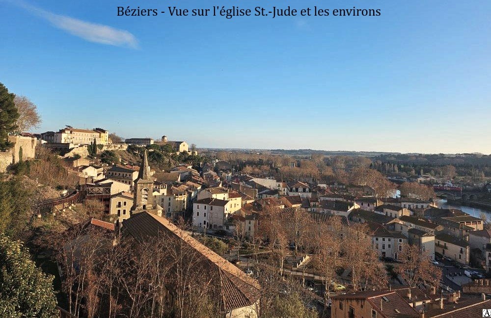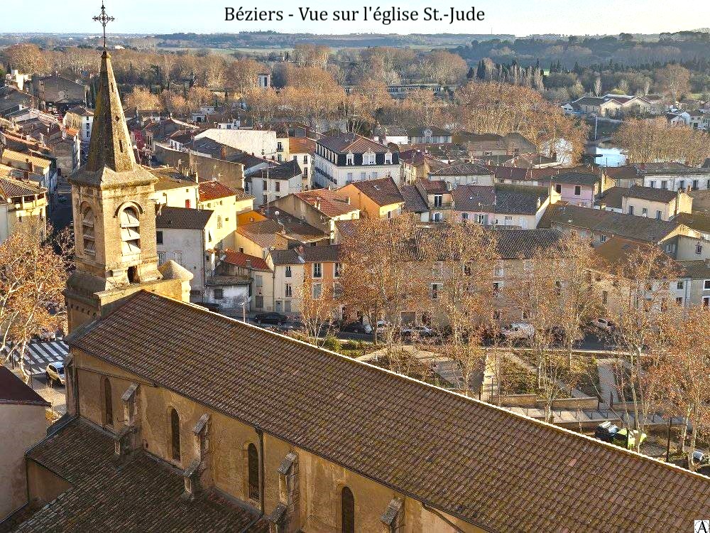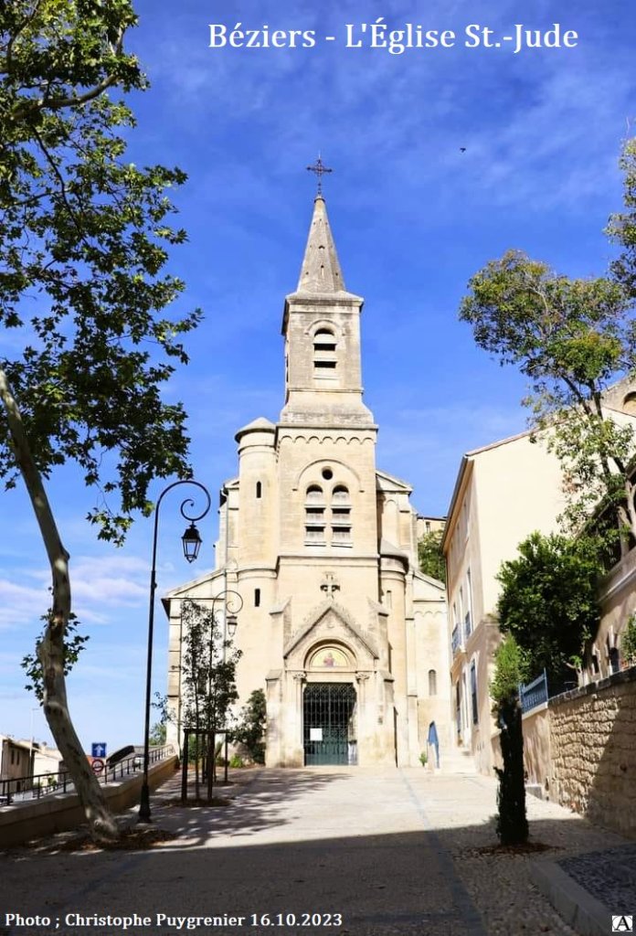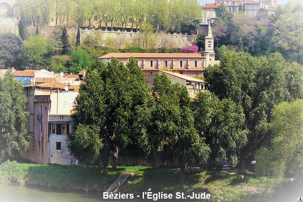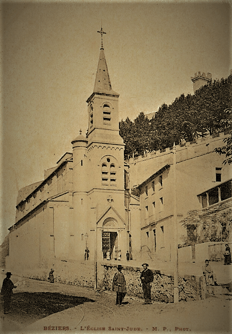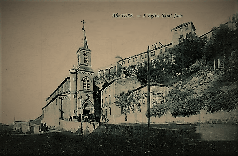 Nichée contre la colline près des berges de l’Orb, l’église Saint-Jude (Saint-Jude est le saint protecteur du quartier du Faubourg) fut bâtie en 1874 avec les fonds propres des habitants du faubourg pour leur servir d’église paroissiale. Les paroissiens du faubourg qui allaient assister aux offices à l’église Saint-Jacques ou à la cathédrale Saint-Nazaire voulaient leur propre église. Un projet avec la mairie n’ayant pas abouti, ils achetèrent l’ancienne maison de maître de M. Garrigue, commissionnaire et la mairie donna l’autorisation de construire une église.