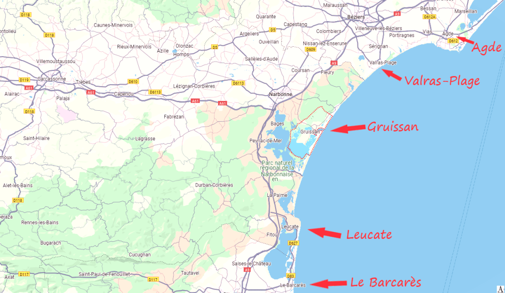 Situé à 45km de Béziers et une quinzaine de kilomètres de Narbonne dans l’Aude, cette station balnéaire propose de belles et grandes plages mais vous pouvez aussi partir en balade dans le Massif de la Clape, un massif long de 17 km et large d’environ 8 km qui culmine à 214 mètres d’altitude, vous balader à travers les vignes ou découvrir les étangs.