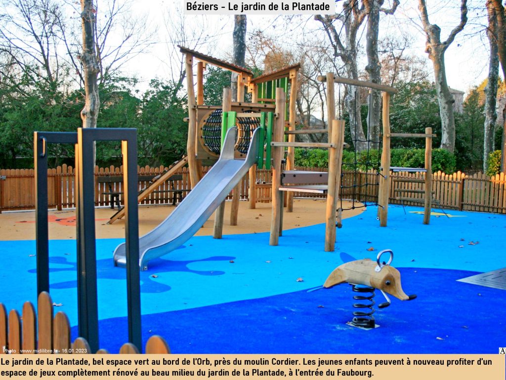 Le jardin de la Plantade, bel espace vert au bord de l’Orb, près du moulin Cordier est un endroit très agréable et ombragé où les familles, parents, grands-parents et les jeunes enfants, mais également des personnes appréciant le calme de l’endroit, aiment se retrouver pour jouer pour les uns et se promener le long du ruisseau de Bagnols jusqu’à l’Orb pour les autres. Très fréquenté par les familles, nul doute que les parents apprécieront ce nouvel espace de jeux.