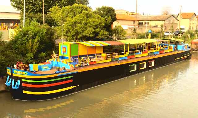 A vendre, cause départ à la retraite, péniche originale très colorée, exploitée à quai comme établissement flottant recevant du public.