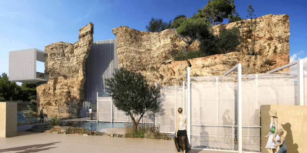 Reproduisant l’ambiance d’une calanque grecque, le futur aquarium de Bayssan dialoguera avec le parc de verdure des Jardins de Méditerranée. Dans son écrin de pierres, il s’intégrera dans le site comme un symbole naturel. L’aquarium sera en effet composé d’une enveloppe extérieure évoquant les côtes rocheuses d’une île méditerranéenne. Cardinal Édifice a notamment été choisie pour son expertise en béton préfabriqué avec des panneaux béton matricé reproduisant l’aspect de parois rocheuses. Une technique déjà utilisée avec succès pour le projet Lascaux IV, réplique intégrale de la célèbre grotte ouverte au public en 2016.