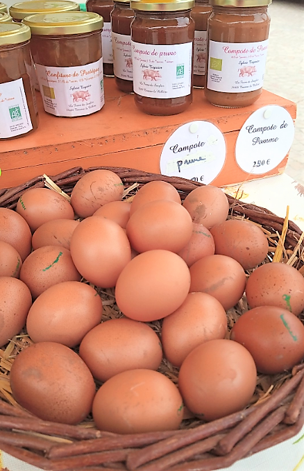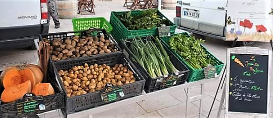À l’heure actuelle, le marché propose des légumes, quelques fruits et produits transformés issus de l’agriculture biologique, des escargots, de la viande et de la charcuterie, du poisson fumé, du fromage de chèvre et brebis, du miel, du vin, de l’huile d’olive ainis que des créations artisanales (vannerie céamique, cuir, …).
