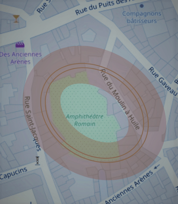 Le parcours démarre à l’Office du Tourisme, ou l’on peut retirer les tablettes. Après une introduction sur l’ancien Forum romain, le GPS guide le visiteur jusqu’à la Place St Cyr, où les arènes apparaissent, entièrement reconstituées en images de synthèse.