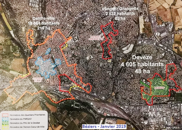 Avec le centre-ville et La Devèze, l’Iranget-Grangette est l’un des trois quartiers prioritaires (QP) de l’unité urbaine de Béziers, dans le cadre du dispositif de la politique de la ville. Ce quartier, qui s’est développé dans les années 60-70 (rénové dans les années 80) sur d’anciennes terres agricoles, a été construit, au départ, pour accueillir des populations principalement ouvrières du bâtiment et des travaux publics dans des logements sociaux, petit habitat collectif ou petites maisons individuelles.