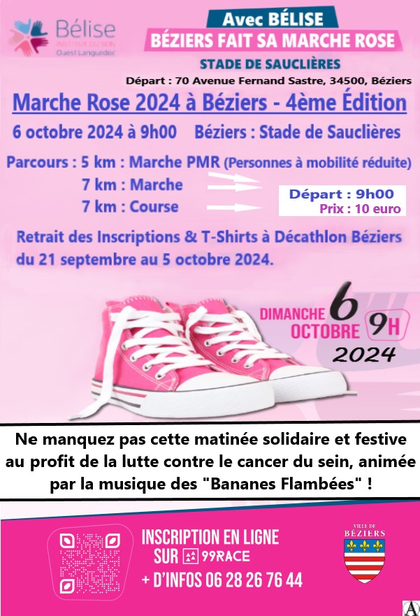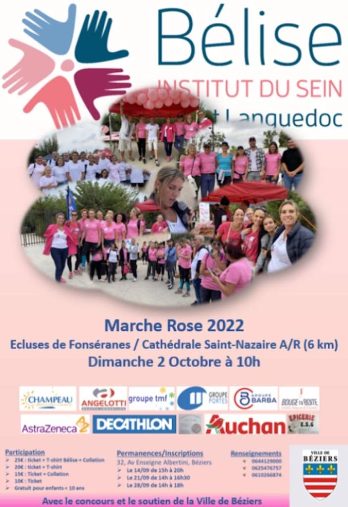 Il devrait y avoir du monde, dimanche 1er octobre 2023, à la Marche Rose de l’association Bélise, Institut du sein en Ouest-Languedoc. Pour cette troisième édition, le rendez-vous est donné en famille, entre amis ou collègues, pourquoi pas en équipes constituées, à partir de 9 h sur le parvis du restaurant Le 9, aux 9 Écluses, pour une marche de 6,3 km, empruntant un circuit exceptionnel, familial et de douce convivialité. La balade partira des 9 Écluses de Fonséranes pour se hisser à la cathédrale Saint-Nazaire puis rejoindra son point de départ en descendant les ruelles de la vielle ville et longeant les berges du canal du Midi. Au retour, petite restauration possible sur place avec la présence d’un Food Truck, ambiance musicale et tombola.