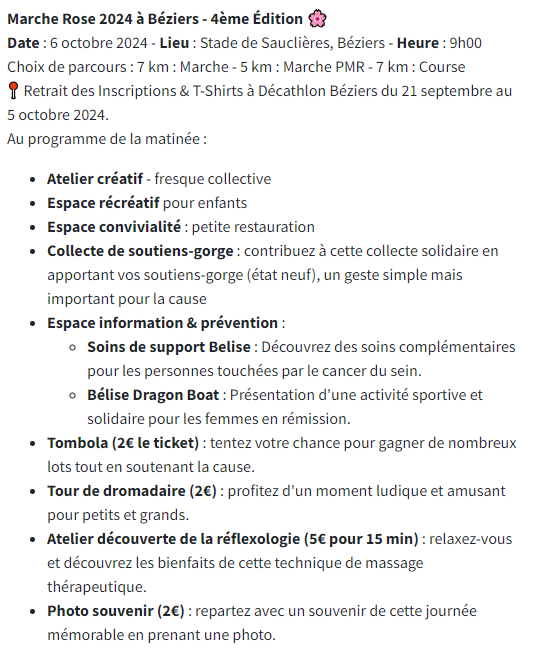 Inscription à la Marche Rose du 1er octobre 2023 à Fonserane, au 06 25 47 67 57 ou 06 44 12 90 00. Prix : 20 € le ticket avec un tee-shirt, 10 € le ticket. Gratuit pour les moins de 10 ans.