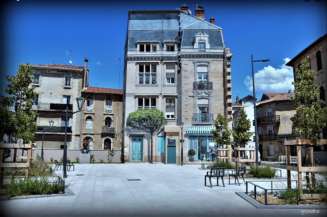 Débarrassé d’une vieille station-service hors d’usage, le terrain en forme de triangle a été couvert d’un revêtement de pierre et planté d’arbres.Sur une façade, un trompe-l’œil montre celui qui était … .