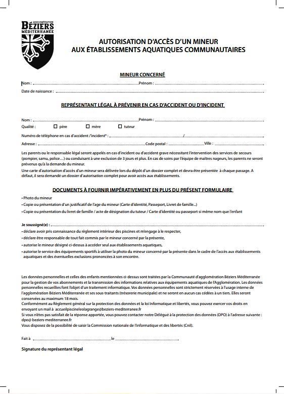 • formulaire de demande dûment complété et signé (disponible à l’accueil des piscines ou sur le site lagglo.fr)