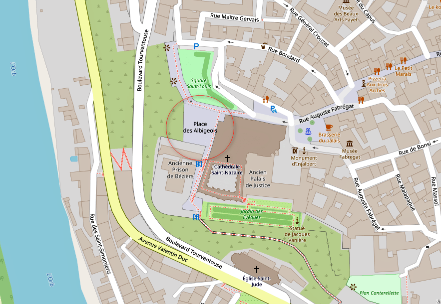 C’était avant la “Place St Louis” (1807) et au moyen-âge la “Place Saint Nazaire” ou “Cimetière de l’église Saint Nazaire”. La rue des Albigeois s’appelait “Rampe de St Louis” et “rue de la descente Tourventouse” (1807).