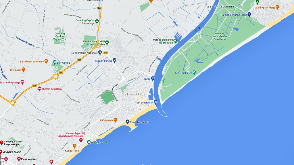 Valras plage, située à l’embouchure de l’Orb, se trouve à 15 km de Béziers, à 30 km de Narbonne et à 70 km de la capitale languedocienne, Montpellier, aux confins des vignes et du Canal du Midi. Elle est la façade maritime de l’agglomération Béziers-Méditerranée.