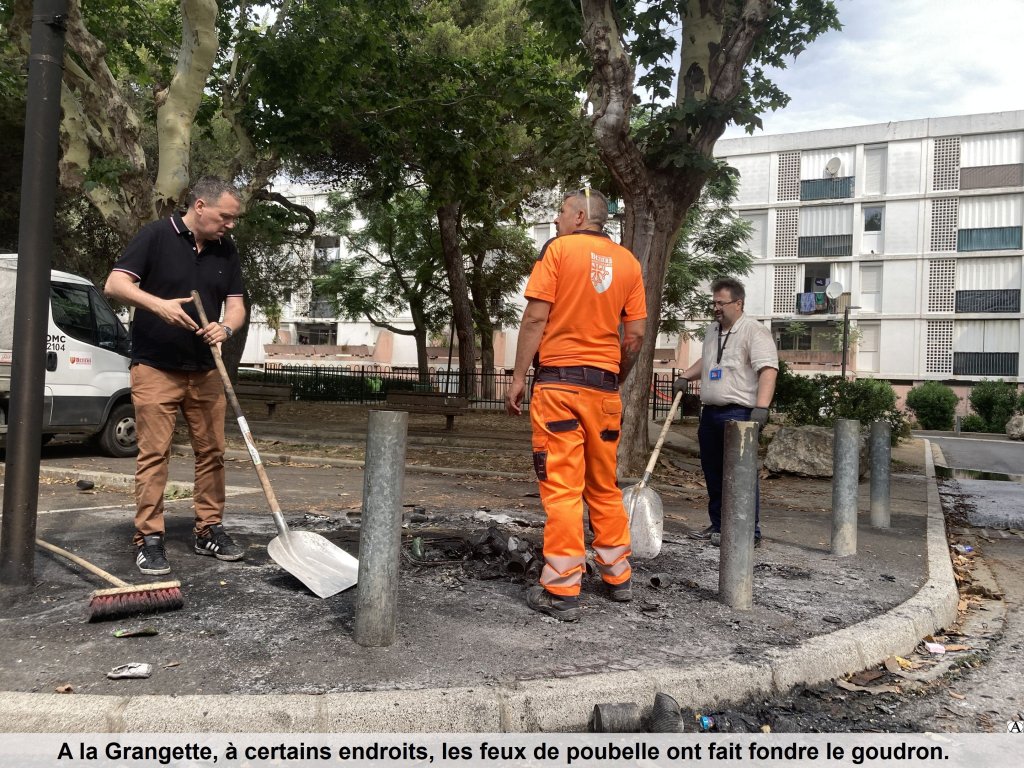 30.6.2023. Comme La Devèze, la Grangette a subi de nombreuses dégradations dans la nuit de jeudi 29 à vendredi 30 juin. Tour du quartier le lendemain à la rencontre des habitants sous le choc et des agents de l’Agglo qui tentaient d’effacer les traces des violences.